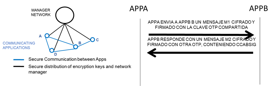 Las comunicaciones se realizan directamente de App a App, sin intervención de un Servidor de Distribución. Cada uno de los mensajes M1 y M2, intercambiados entre unos comunicantes APPA y APPB, se cifran con una diferente clave simétrica de un único uso, clave otp, obtenida usando la clave fija KAB, que se les ha distribuido de forma segura en el momento de su emparejamiento, y un valor aleatorio de un único uso gestionado por el protocolo.