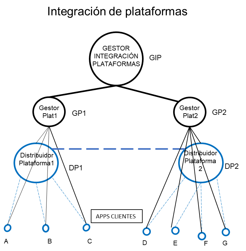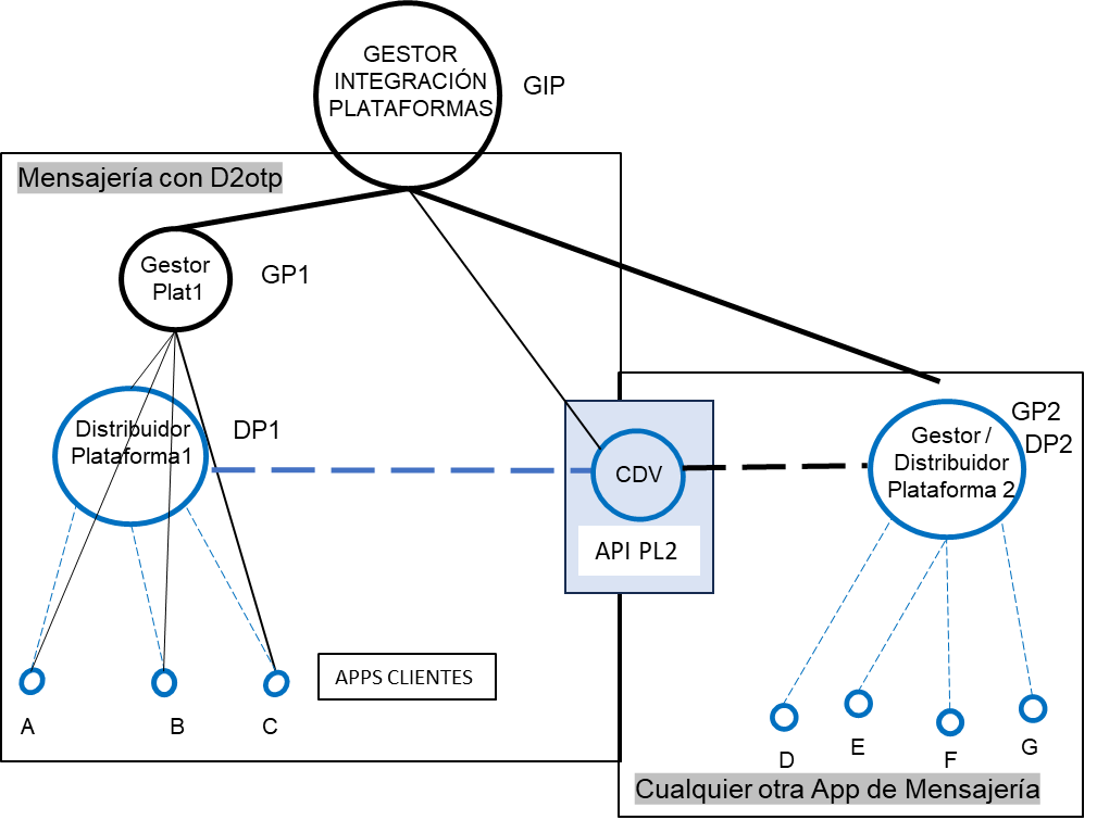 La Comunicación entre C, de una Red D2OTP, y D, de otra Red no D2OTP es posible gracias a que el Gestor de Integración de Plataformas hace uso de un nodo virtual que actúa como API (Interfaz de Programación de Aplicaciones) que permite a los Servidores Distribuidores entenderse, aunque no compartan una misma infraestructura tecnológica ni protocolo de comunicación.